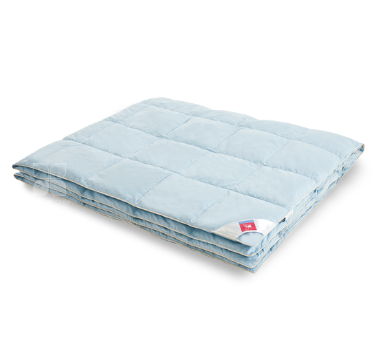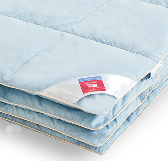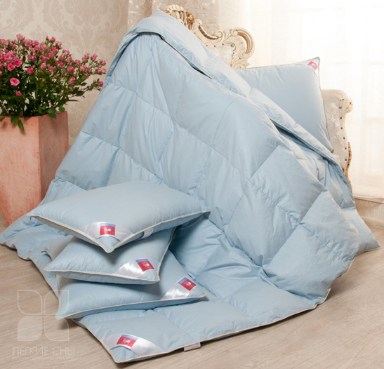 Одеяла выпускаются в двух вариантах цвета: небесно-голубой и теплый — шампань из пуходержащего тика, по периметру отделка шелковым кантом, оттеняющим его своим блеском.